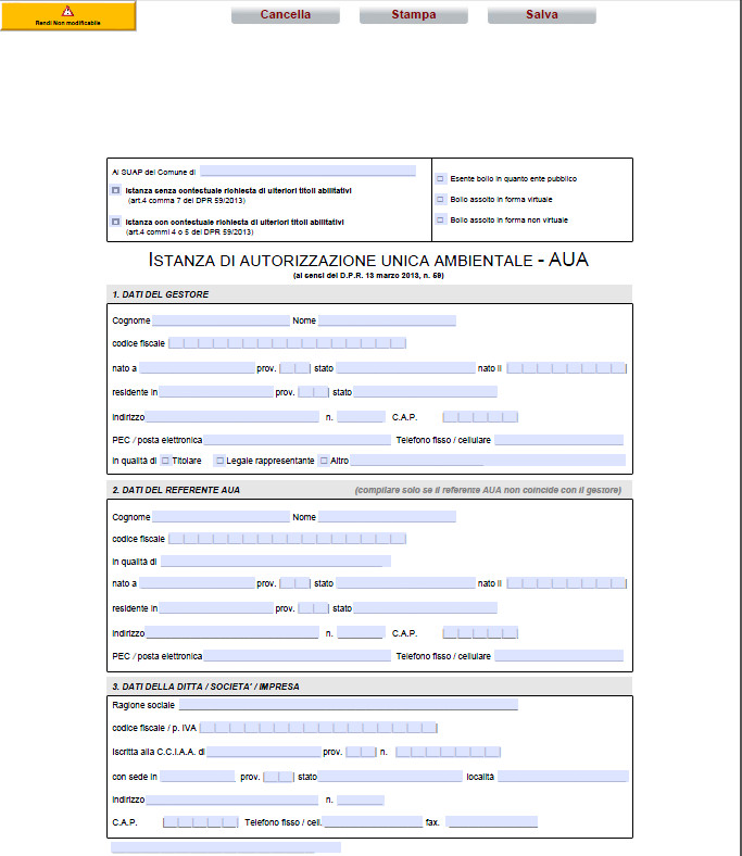 Modello istanza di di autorizzazione unica ambientale del 30 giugno 2015, n. 149 – A.U.A. editabile – ISTANZA DI AUTORIZZAZIONE UNICA AMBIENTALE – AUA (ai sensi del D.P.R. 13 marzo 2013, n. 59)