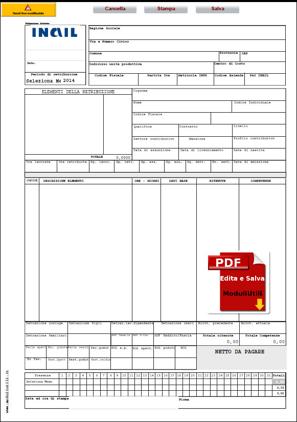 Modello Busta Paga, utilizzabile sia come cedolino paga, sia come Libro Unico del lavoro(*).
